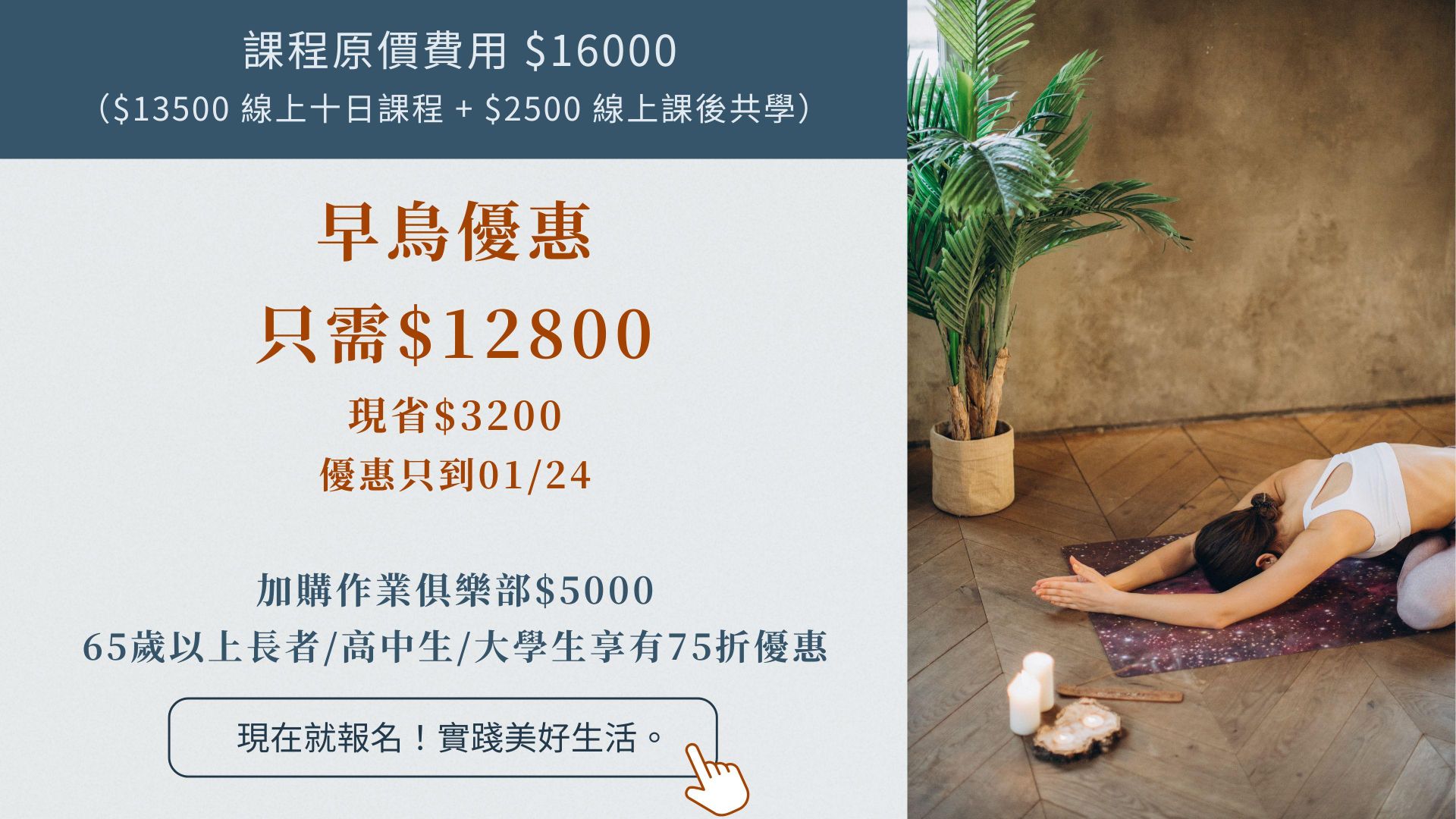 - 正式課:原價$16000(超早鳥優惠$12800)