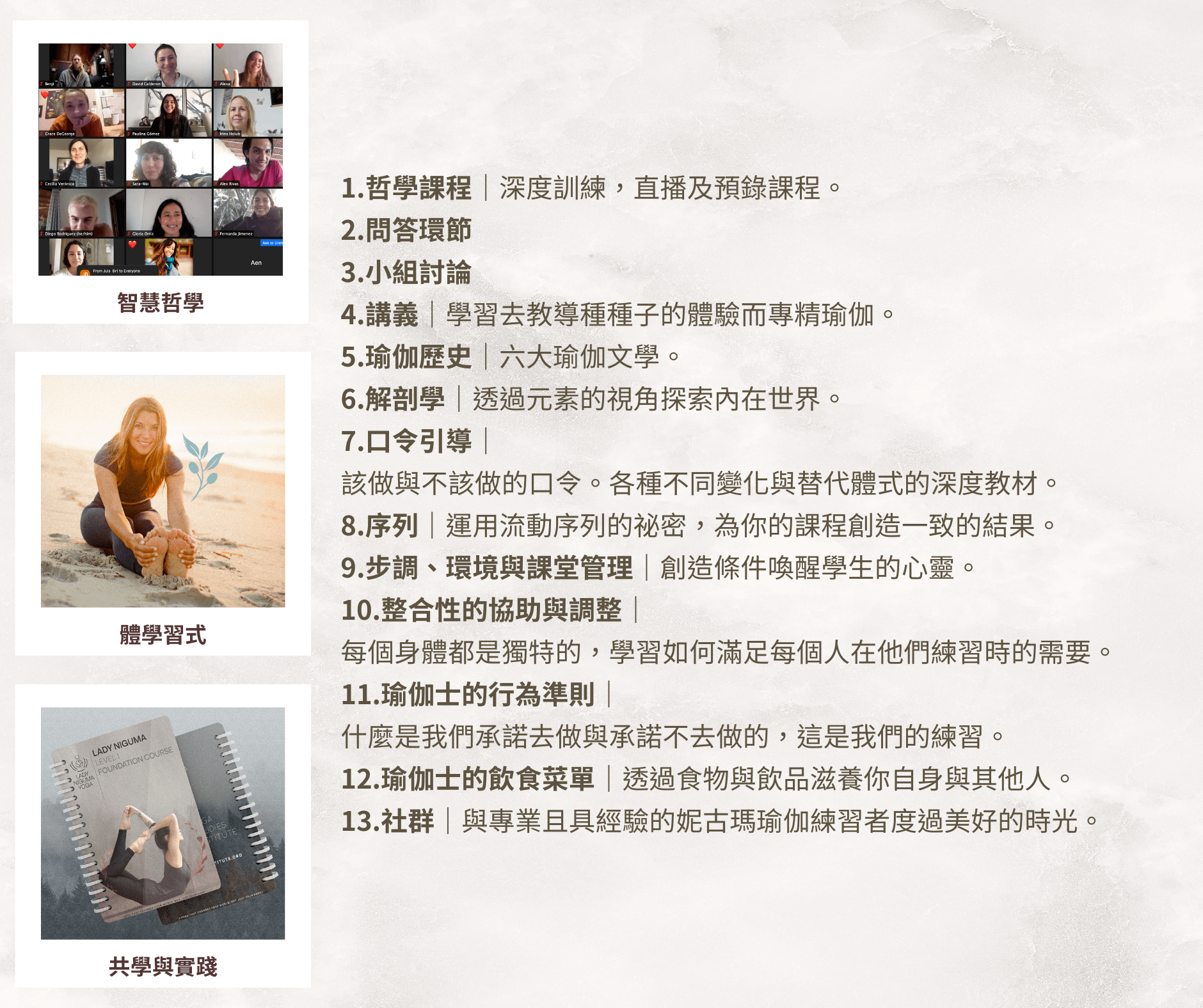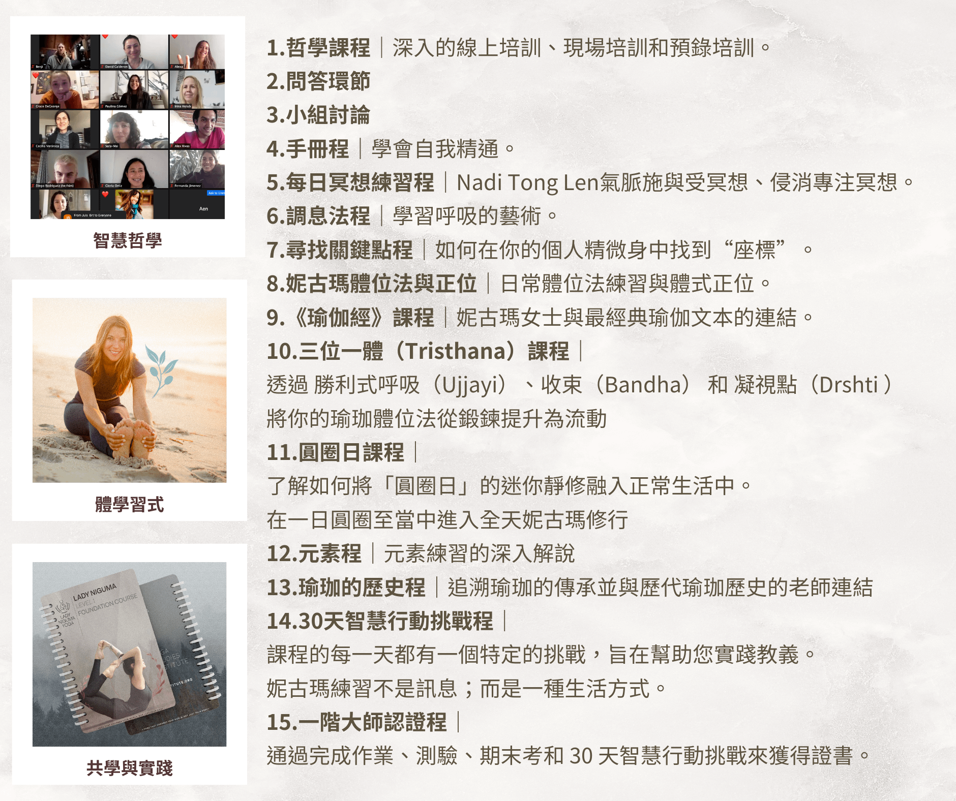 教授瑜伽體式、呼吸法、冥想、瑜伽哲學