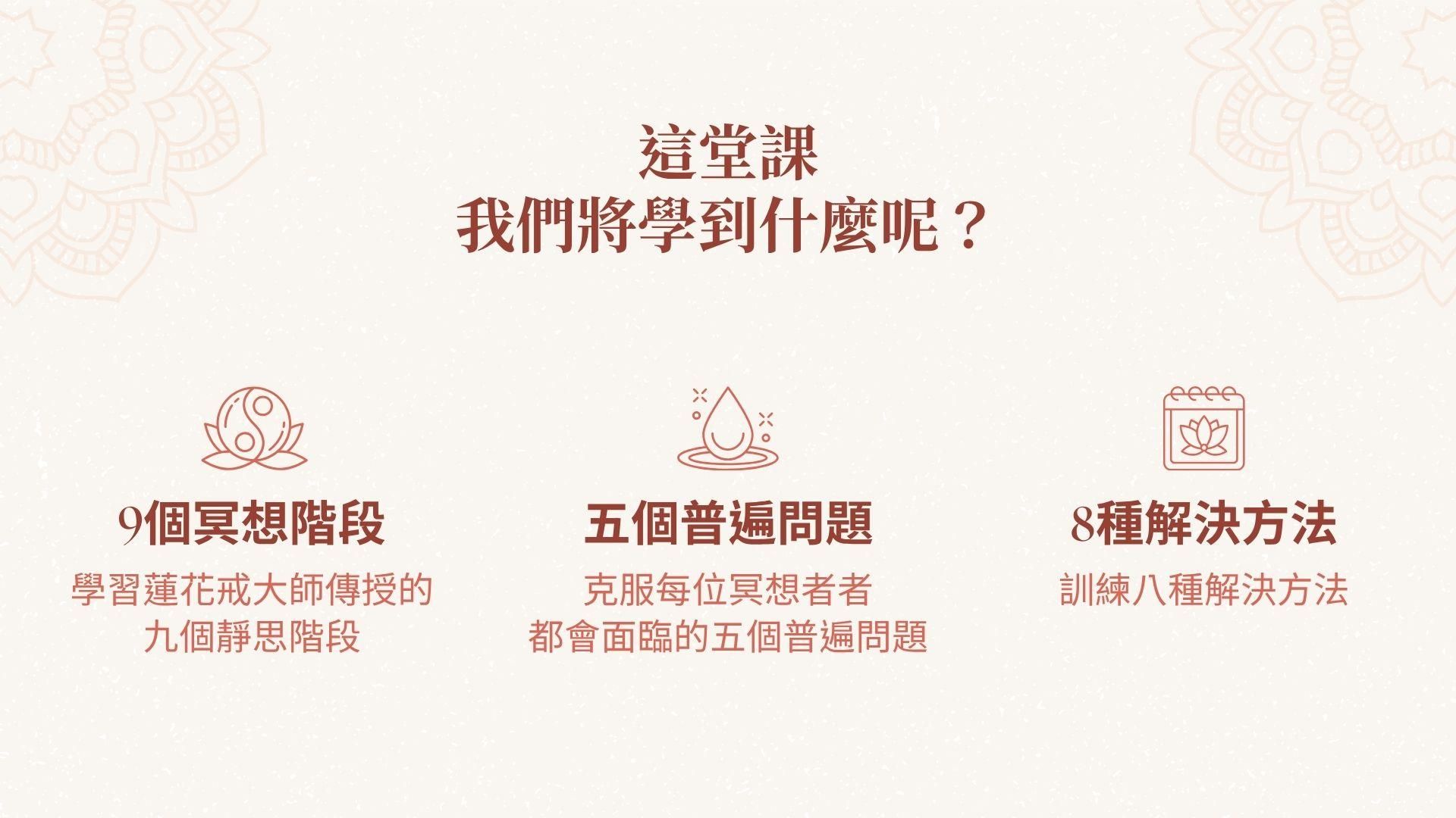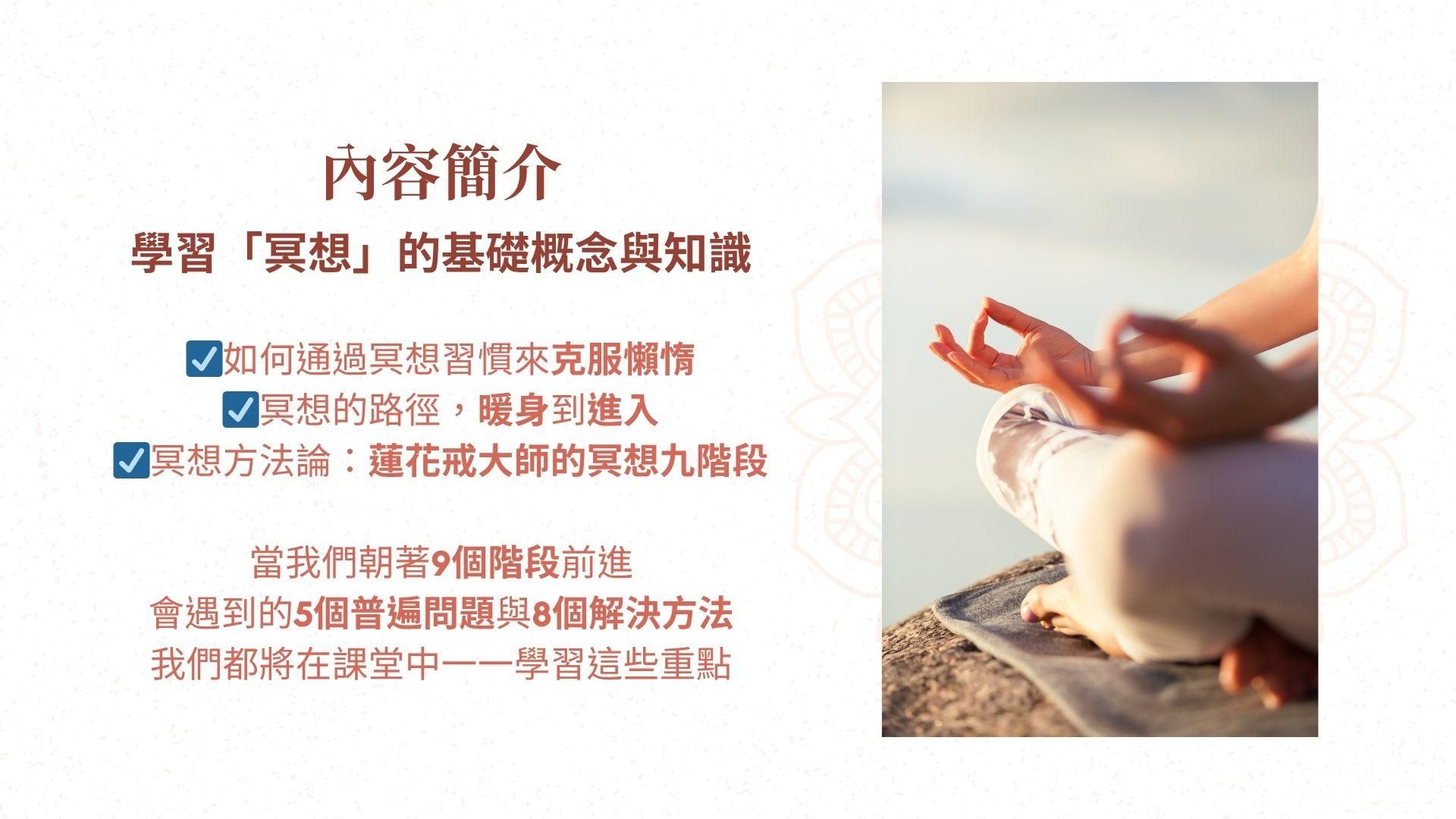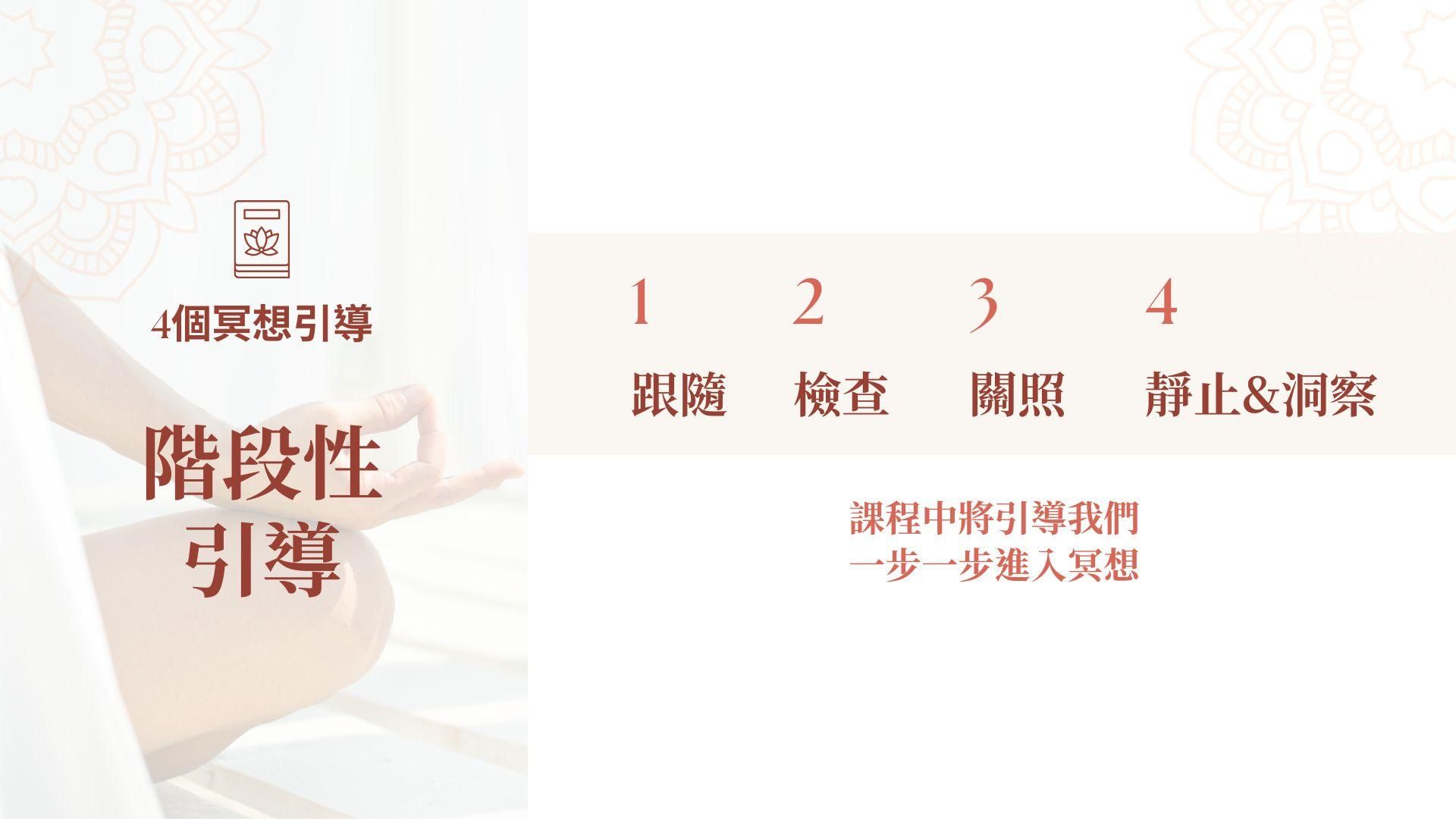 🔹並非一坐下來就直接進入冥想,而是放緩節奏,,以一種美好的方式完成這一過渡。 - 第四課:冥想的九個階段