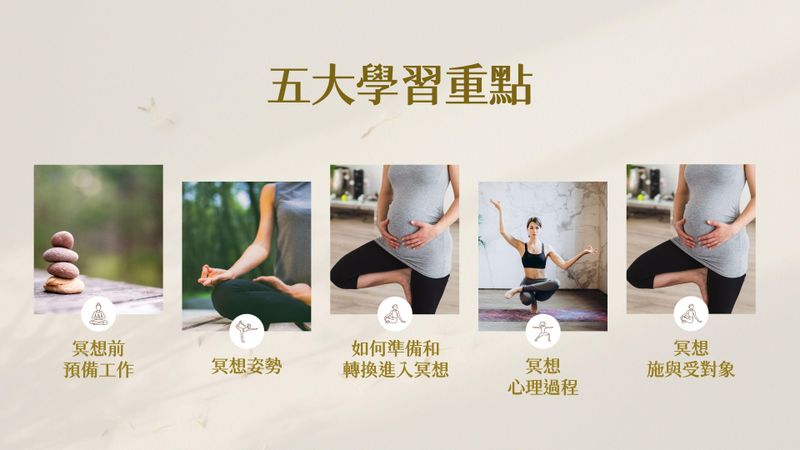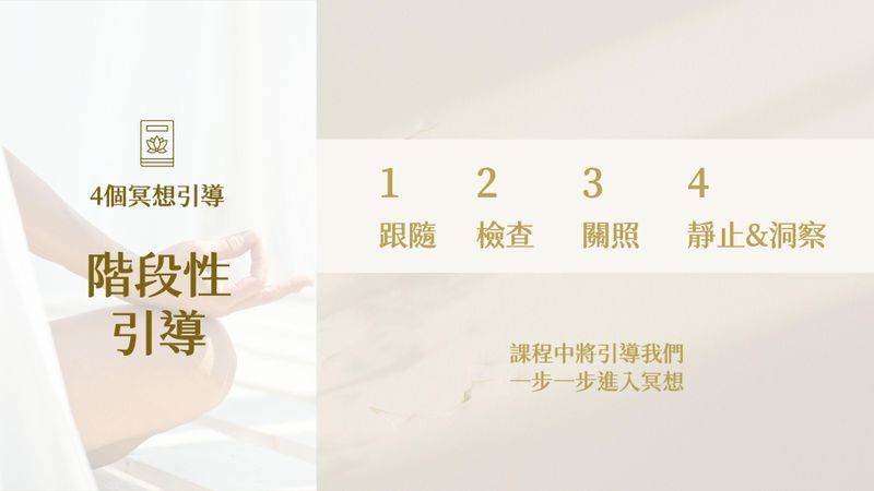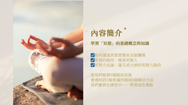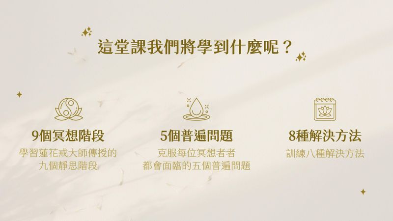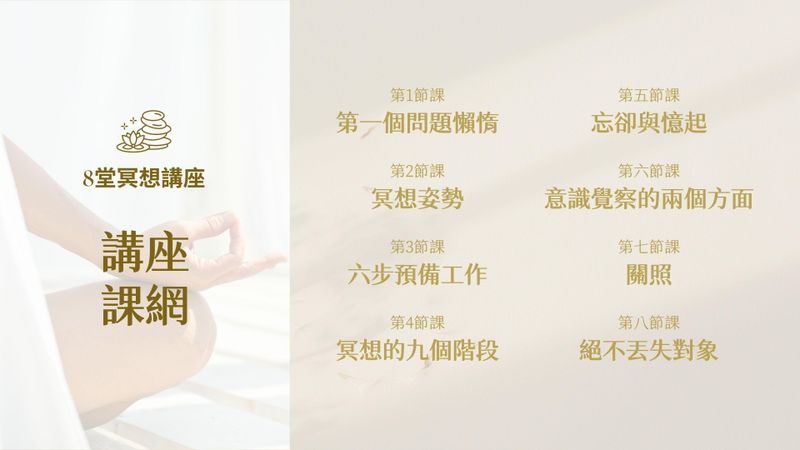 🔹並非一坐下來就直接進入冥想,而是放緩節奏,,以一種美好的方式完成這一過渡。 - 第四課:冥想的九個階段