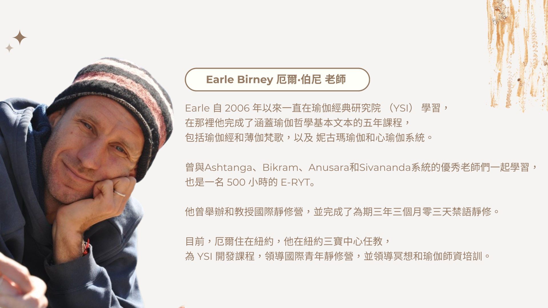 「幸福有瑜」由YSI瑜伽經典研究院的Earle老師授課,Earle Birney 厄爾·伯尼老師不僅是為瑜伽練習者,更完成三年三個月三天大閉關(禁語靜修),長期專研古瑜伽經典與智慧,是生活瑜伽的實踐者。